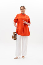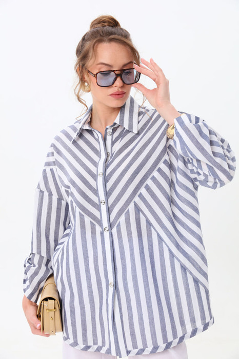 Рубашка прямого силуэта с притачной планкой с застёжкой на петли и пуговицы. Рукав втачной одношовный со спущенной линией плеча с патой. Воротник рубашечный стояче-отложной. Перед состоит из трёх частей : центральная часть ,верхняя часть и нижняя часть. Спинка состоит из двух частей . Линия низа фигурная с широкой окантовкой.