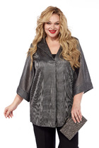 Блуза женская прямого силуэта, свободного кроя. Выполнена из блузочной ткани. Горловина оформлена воротником. Спинка и перед цельные. На переде расположена центрально-бортовая (потайная застежка) на петли и пуговицы. На стойке пришита декоративная пуговица. Низ блузы фигурный  фантазийной формы.