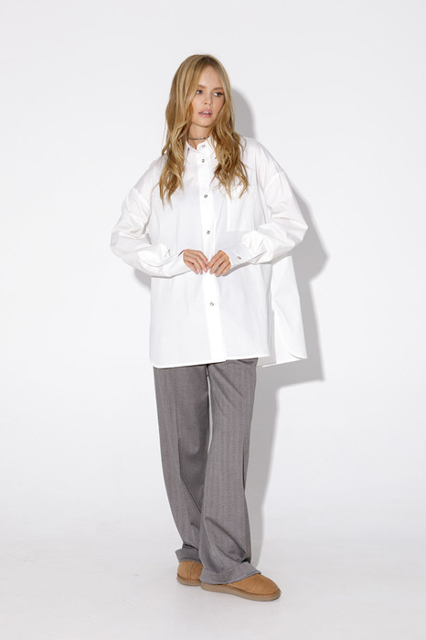 Хлопковая оверсайз рубашка. Детали: рубашка прямого силуэта, спущенная линия плеча, застежка на петли и пуговицы, длинные рукава с притачными манжетами, фигурный низ.