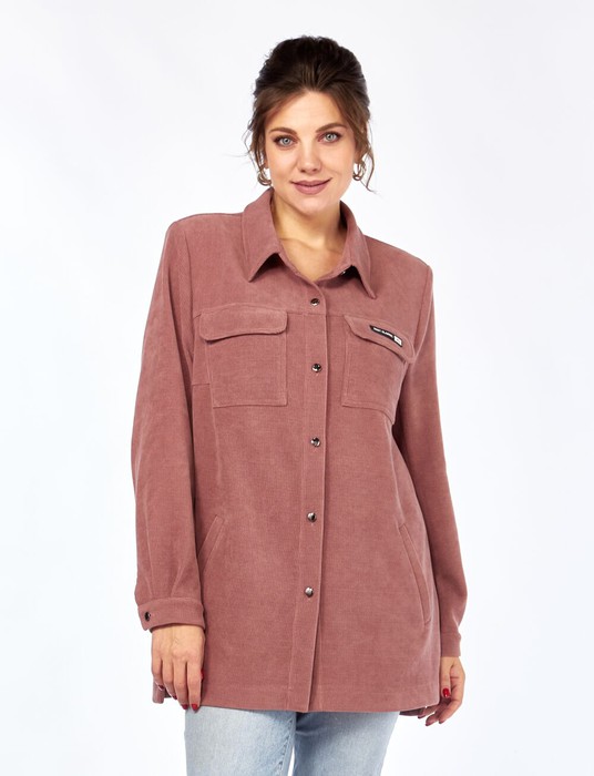 Рубашка прямого кроя с застёжкой-планкой на шесть петель и пуговиц. На переде обработаны нагрудные вытачки, кокетки, накладные карманы с клапанами, прорезные карманы с листочками. Спинка с кокеткой, складкой и отделочной шлёвкой по центру. Рукав втачной, длинный, по низу застёгивается манжетой с пуговицей. Воротник стояче-отложной с отрезной стойкой. В боковых швах разрезы, низ рубашки разноуровневый. Материал хорошо тянется(трикотажная основа) и держит тепло, поэтому жакет комфортно носить в прохладную погоду.