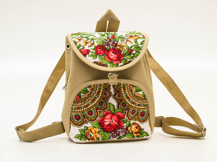 Рюкзаки "Матрешка" представлены в трех размерах и пяти основных цветах: синий, черный, бежевый, красный, розовый, с различными вставками с цветочным рисунком по мотивам павлопасадского платка.