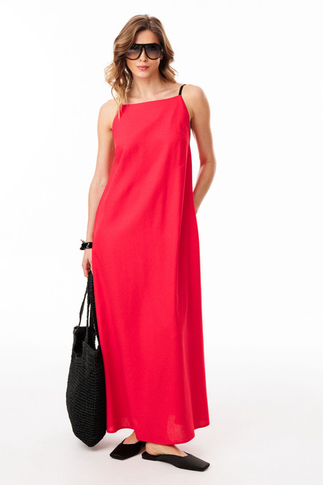 Сарафан выполнен из льна. Сарафан А-образного  силуэта, длиной до линии щиколотки, на регулируемых бретелях. По переду обработаны нагрудные вытачки. На спинке обработан средний шов, округлый вырез с контрастными завязками.  Пройма V-образной формы.