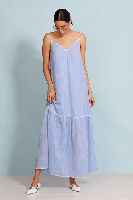 Изделие на хлопковой подкладке. Длина  maxi. Свободное  в талии и  бедрах, в духе минимализма. Изделие без застежки.  V-образный вырез горловины и спинки. Изделие отрезное выше линии колена. Нижняя часть платья собрана на сборку. Изделие декорировано хлопковым кружевом.