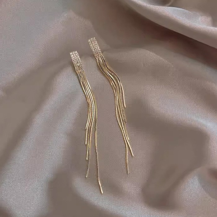 Великолепные и модные длинные висячие серьги со свисающими кисточками-цепочками прекрасно подходят практически к любым нарядам: и к платьям с открытыми плечами, и к классической чёрной водолазке. Струящиеся серьги-подвески со стразами будут привлекать внимание игривым блеском. Трендовые серьги подчеркивают женственность и утонченность, делая ваш образ еще более нежным. Висячие элементы создают эффект удлиненных линий, который особенно хорошо смотрится в сочетании с вечерними или свадебными нарядами.