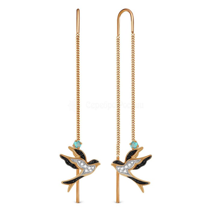 Серьги-продёвки Ласточки из золочёного серебра с фианитами и черным родированием