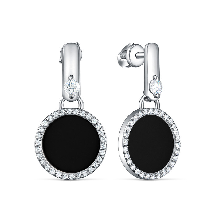 Серьги-пусеты из серебра с чёрным агатом и фианитами родированные 925 пробы С-41