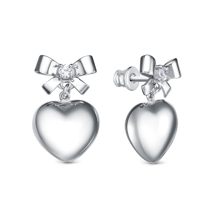 Серьги-пусеты из серебра с фианитами родированные - Сердца, банты 221-10-256р