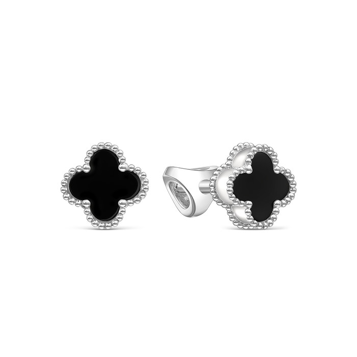 Совместные покупки Тюмень Ювелирные украшения и бижутерия Серьги — Серьги-пусеты Клевер Четырехлистник из серебра с чёрным агатом родированные 925