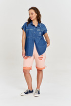 Шорты женские прямого свободного кроя, выполнены из эко-кожи шоколадного цвета. Пояс шорт стабильный с шлевками, застежка петля-пуковица и молния. По переду прорезные карманы. Длина по боковому шву 43 см.