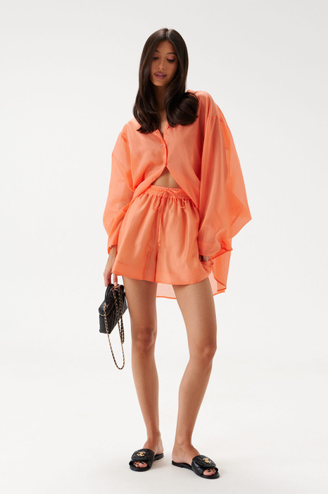 Шорты свободного кроя. Пояс на резинке с завязками. В боковых швах карманы. Есть подкладка. Длина 40 см