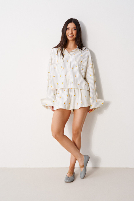 Шорты свободного кроя. Выполнены из хлопковой (смесовой) ткани цвета "пломбир" в полоску с вышивкой лимоны. Пояс на резинке. Застёжки нет. Карманы с отрезным бочком в боковых швах. Длина с учётом пояса 34 см