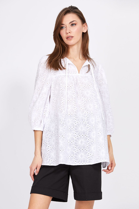 Шорты выполнены из плательной ткани. Шорты расширены к низу, низ шорт на манжетах. Талия завышена. Карманы в боковых швах. Пояс притачной, завязывающийся на бант, частично на эластичной тесьме.