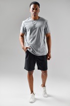 Шорты мужские из пластичного однотонного трикотажного полотна в рубчик, приятного к телу. Модель свободная, с боковыми карманами с обтачными входами, на притачном поясе с отстроченной эластичной тесьмой.
