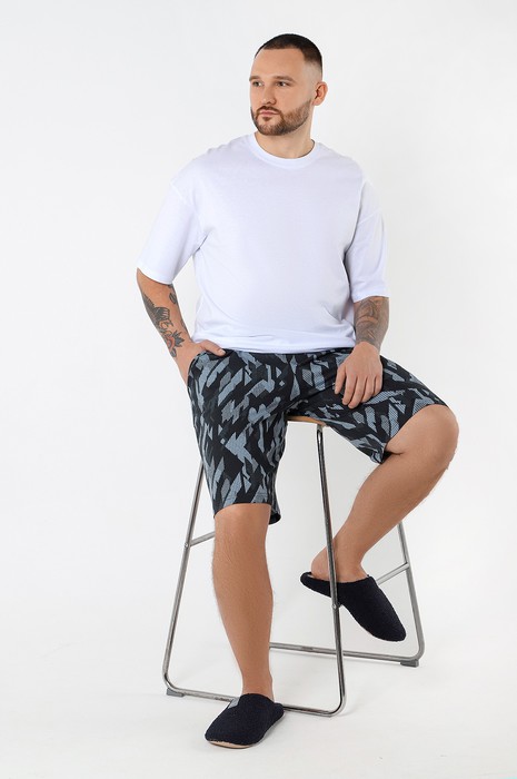 Шорты мужские из трикотажного полотна "кулирка" с набивным рисунком, удлиненные, на притачном поясе с эластичной тесьмой внутри, с карманами в боковых швах, входы в которые окантованы основным материалом.