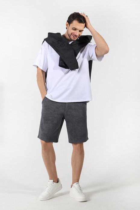 Шорты мужские из трикотажного полотна "футер-трехника -петля", на притчном поясе с эластичной тесьмой внутри, с карманами в боковых швах и имитацией застежки "гульфик". В центре пояса - две обметанные петли, чере которые продет шнурок с наконечниками для регулирования степени прилегания шорт по талии.
