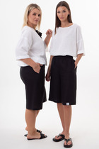 Шорты прямого силуэта, длиной до середины бедра, на притачном поясе с резинкой по спинке. По задним половинкам талиевые вытачки. По передним половинкам застрочены стрелки, обработаны боковые карманы с наклонным входом, и застежка на тесьму-«молнию» с гульфиком и откосом. По поясу застежка на кнопку.