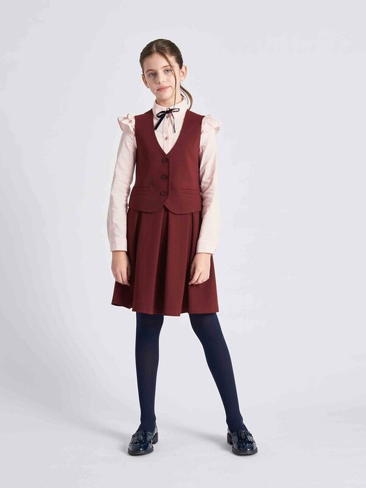 Классический комплект  для девочки. Жилет полуприлегающего силуэта с V-образным вырезом и боковыми прорезными карманами с листочками застегивается на три пуговицы. Юбка А-силуэта с втачным поясом и симметричными мягкими складками. Застегивается на потайную молнию в боковом шве и пуговицу на поясе. Задняя часть пояса на резинке.