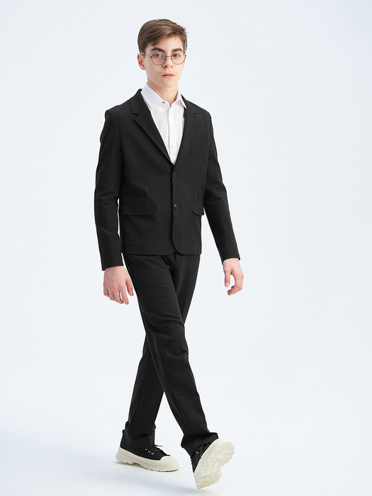 Классический костюм 2-йка для мальчика из трикотажа. Пиджак полуприлегающего силуэта с английским воротником и длинными втачными рукавами. Дополнен прорезными карманами с клапаном. Застегивается на 2 пуговицы. Брюки зауженные на поясе с еврорезинкой сзади. В боковых швах расположены карманы, горизонтальные защипы и застёжка - гульфик на молнии. Сзади расположены карманы с листочкой.