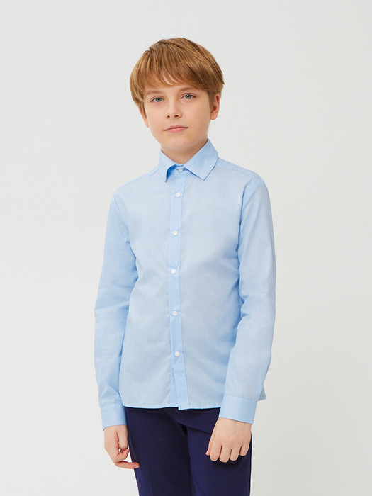 Сорочка для мальчика из смесового хлопка полуприлегающего силуэта. На спинке - кокетка. Воротник отложной со стойкой. Застёжка по центру переда на планку с кнопками. Рукава рубашечные со шлицами и манжетами.