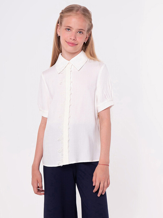 Романтичная блузка из вискозы полуприлегающего силуэта с кружевным воротником и ажурным кружевом по переду изделия. Блузку дополняют объемные короткие рукава со встречными складками и манжетом. Застежка центральная на планку с пуговицами. Отличный вариант на каждый день. "