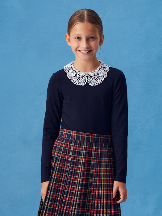 Трикотажный джемпер для девочки с длинными рукавами и кружевным воротником. Застёжка на спинке на пуговицу обеспечивает удобство в носке.
