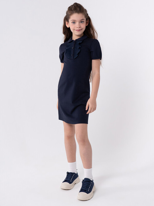 Трикотажное платье с короткими рукавами отлично подходит для школы. Оно выполнено без подкладки, что обеспечивает комфорт в течение всего дня. Застегивается на пуговицы расположенные на притачной планке, украшенной кружевом.