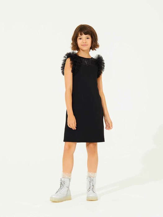 Оригинальное платье для самых стильных принцесс. Оно выполнено из приятного к телу трикотажа, который обеспечивает комфорт во время активных игр. Перёд платья оформлен мягкой сеткой с пайетками, что придает платью праздничность. Многослойные рукава из сетки придают платью объем и воздушность, а прямой силуэт добавляет баланса образу. Застежка на потайную молнию по спинке обеспечивает комфорт и легкость при надевании. Это платье станет идеальным выбором для любого торжества или праздника.