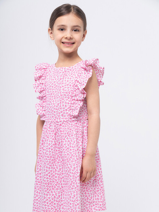 Платье летнее без рукавов из смесового хлопка с мелким орнаментом. Прилегающий верх и расклёшенная отрезная юбка с мягкими складками делают силуэт неотразимым. Аккуратный вырез горловины подчёркивает красоту шеи. На груди и спике акцентные валаны.