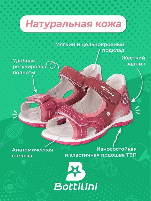сандалии спортивного фасона с элементами профилактики плоскостопия. изготовлены из натуральной высококачественной кожи. подошва изготовлена из износостойкого, упругого и нескользящего материала с естественным перекатом в передней части стопы. многослойная стелька с супинатором и умеренной выкладкой свода поддерживает стопу и препятствует формированию плоскостопия. внутренняя часть жесткого фиксирующего задника изготовлена из термопласта, который не деформируется и держит заднюю часть стопы в естественно-правильном положении при ходьбе. мягкий кант смягчает контакт голени с обувью, а цельнокройная подкладка без лишних швов минимизирует риск натирания кожи. застежки вкупе с широкой раскрываемостью моделей обеспечивают идеальную подгонку обуви по полноте.