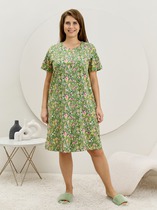 Сорочка женская из трикотажного полотна "кулирка" с набивным рисунком слегка расширенная книзу, с короткими втачными рукавами и горловиной овальной формы, обработанной притачной бейкой и фигурной линией низа. Перед - с отрезной кокеткой с разрезом по центру, обработанным притачными узкими планками и скрепленными между собой тремя пуговицами.
