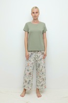 Сорочка женская из гладкокрашенного трикотажного полотна "кулирка" слегка расширенная книзу, с короткими втачными рукавами и горловиной овальной формы, обработанной притачной бейкой и фигурной линией низа. Перед - с отрезной кокеткой с разрезом по центру, обработанным притачными узкими планками и скрепленными между собой тремя пуговицами.