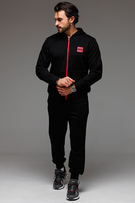 Яркий повседневный мужской спортивный костюм из комфортной ткани (футера без начеса), который подойдёт для дома, прогулок, путешествий и просто отдыха. Состоит из худи с контрастной застежкой молнией и брюк-джоггеров.