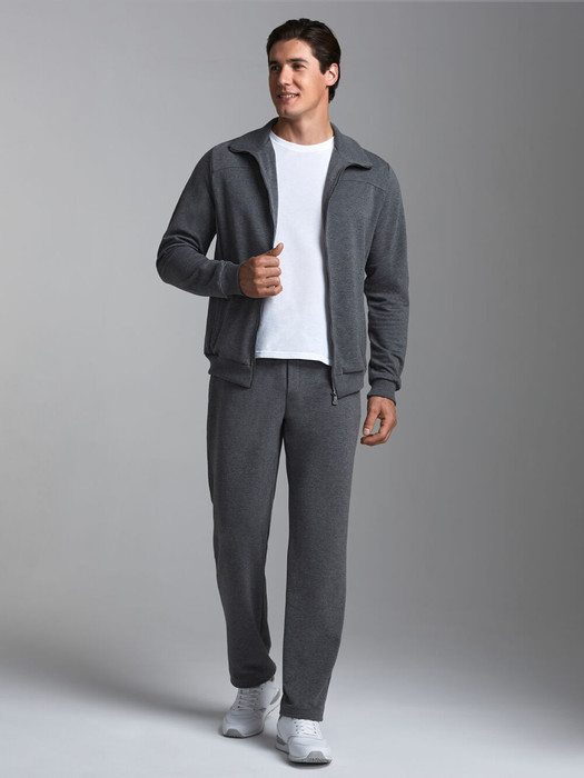 Мужской спортивный костюм из эластичного хлопкового трикотажного полотна. Куртка прямая с воротником, застегивается на молнию. Рукава втачные. Воротник, манжеты и пояс куртки выполнены из эластичного трикотажа. Брюки прямого силуэта. Прорезные карманы куртки и брюк застегиваются на молнии. Пояс брюк эластичный, по линии талии дополнительно регулируется шнуром.