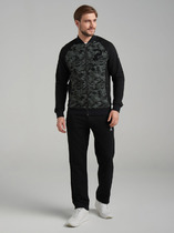 Спортивный костюм из хлопкового трикотажного полотна. Куртка костюма на поясе, с воротником-стойкой, с легким капюшоном, застегивается на молнию. Рукава втачные. Несколько деталей костюма изготовлены из водонепроницаемой плащевой ткани в тон изделия - это капюшон, вставки рукавов, переходящие в плечевые кокетки, бочки куртки, боковые вставки брюк. Ветрозащитная планка из плащевой ткани закрывает молнию. Все карманы комплекта застегиваюся на молнии и расположены в швах боковых деталей, Лицевая часть капюшона регулиреутся резиновым шнуром с помощью металлических фиксаторов.Пояс, воротник и манжеты куртки изготовлены из эластичного подвяза. Брюки прямые, зауженные книзу. Пояс брюк по линии талии с эластичной резинкой так же дополнительно регулируется шнуром. На левой груди и под левым карманом брюк нашиты шевроны с фирменным логотипом