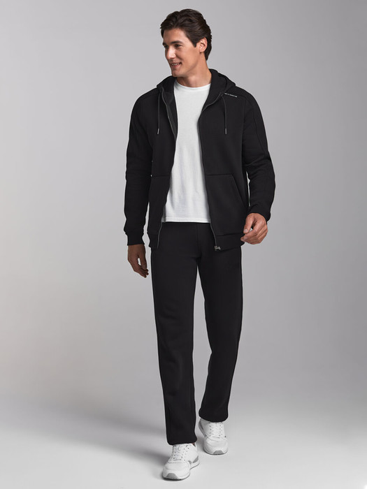 Спортивный костюм изготовлен из плотного хлопкового трикотажного полотна с изнаночным начесом. Куртка костюма на поясе, с капюшоном, застегивается на молнию. По плечам и верхней части рукавов есть вставка, выгодно подчёркивающая линию плеча. Комфортный двухшовный капюшон со стойкой по лицевой части регулируется шнуром. На куртке есть удобные карманы «кенгуру». Пояс и манжеты куртки изготовлены из плотной эластичной трикотажной резинки. Брюки зауженные, низ брюк на резинке. Передние карманы брюк в боковых подрезах. Пояс брюк по линии талии с эластичной резинкой, дополнительно регулируется шнуром. Под карманом брюк, и под швом кокетки куртки - шевроны с фирменным логотипом.
