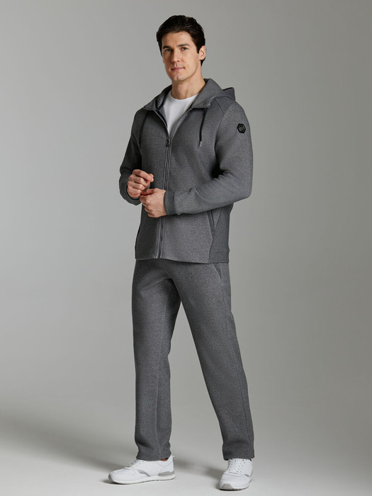 Современная модель мужского костюма из жаккардового трикотажного полотна. Куртка с капюшоном, на молнии, с карманом-кенгуру. Рукава покроя реглан, выполнены из контрастного трикотажного полотна. По низу куртки слегка заужен поясом, рукава с манжетами. Карманы брюк прорезные, наклонные. Низ брюк с манжетами. Пояс брюк эластичный, дополнительно регулируется шнуром. На слева на груди и на левой брючине под карманом - фирменный логотип. На правый рукав логотип нанесен методом термопечати.