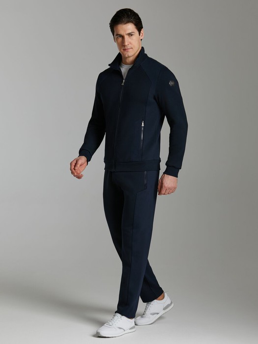 Современная модель мужского костюма из жаккардового трикотажного полотна. Куртка с капюшоном, на молнии, с карманом-кенгуру. Рукава покроя реглан, выполнены из контрастного трикотажного полотна. По низу куртки слегка заужен поясом, рукава с манжетами. Карманы брюк прорезные, наклонные. Низ брюк с манжетами. Пояс брюк эластичный, дополнительно регулируется шнуром. На слева на груди и на левой брючине под карманом - фирменный логотип. На правый рукав логотип нанесен методом термопечати.