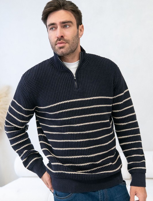 Состав: 60%Хлопок 40%ПАН (акрил) Параметры модели на первом фото: Рост 190, бюст 108, талия 87, бедра 104Свитер с узором полосы выполнен из хлопковой пряжи с добавлением акрила. Теплая модель фактурной крупной вязки с воротом, застегивается металлической молнией. Регулируя ворот можно носить с рубашками, футболками и водолазками. Кроме того, свитер совершенно не колется, поэтому его комфортно носить даже на голое тело. Внизу изделия нашивка бренда из эко-кожи.