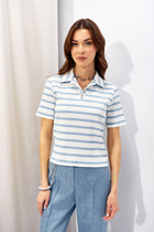 Детали: воротник-поло с застежкой на петли и пуговицы, низ переда и спинки на поясе. Рукава длинные широкие с манжетой по низу. Перед с флоковой печатью.