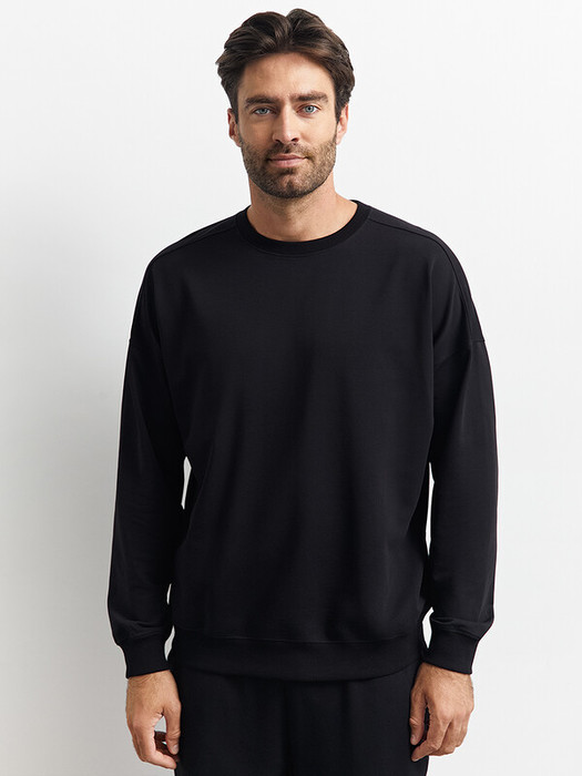 Мужской свитшот свободного кроя из двухниточного футера со спущенным плечом, длинными рукавами и круглым вырезом. Манжеты, горловина и низ, оформленные рибаной в лаконичный рубчик, добавляют текстурности и делают силуэт более графичным.