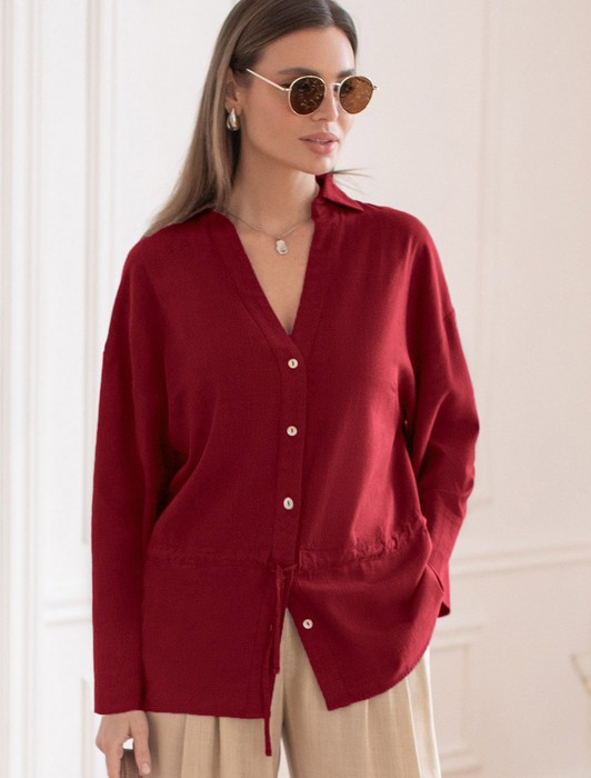 Состав: 70%Вис 30%Лен Плотность: 200 Г/м2Свободная блузка гранатового цвета с кулиской на талии изо льна с вискозой, плотностью 200 Г/м2 - идеальный вариант для весны и лета. Сочетание льна и вискозы обеспечивает комфорт и прохладу в жаркие дни. Материал хорошо драпируется и мягко прилегает к фигуре, создавая струящиеся складки. Эта эффектная блузка сочетает в себе современный крой, удобство и стиль. Отложной воротник придает образу элегантность, спущенная линия плеча — модный и расслабленный акцент, а широкий рукав создает красивый и воздушный силуэт. Талия оформлена утягивающей кулиской, что позволяет регулировать посадку — создайте акцент на поясе для женственного силуэта или носите свободно для комфорта, отлично скроет возможные недостатки. Пуговицы по всей длине делают льняную рубашку особенно практичной, вы можете носить ее растегнутой, как верхний слой. Эта легкая блузка подходит для повседневного гардероба, смотрится красиво и стильно, обеспечивая максимальное удобство, подойдет и на большие размеры.
