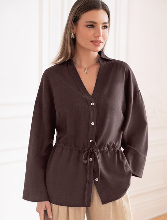 Состав: 70%Вис 30%Лен Плотность: 200 Г/м2Свободная блузка коричневого цвета с кулиской на талии изо льна с вискозой, плотностью 200 Г/м2 - идеальный вариант для весны и лета. Сочетание льна и вискозы обеспечивает комфорт и прохладу в жаркие дни. Материал хорошо драпируется и мягко прилегает к фигуре, создавая струящиеся складки. Эта эффектная блузка сочетает в себе современный крой, удобство и стиль. Отложной воротник придает образу элегантность, спущенная линия плеча — модный и расслабленный акцент, а широкий рукав создает красивый и воздушный силуэт. Талия оформлена утягивающей кулиской, что позволяет регулировать посадку — создайте акцент на поясе для женственного силуэта или носите свободно для комфорта, отлично скроет возможные недостатки. Пуговицы по всей длине делают льняную рубашку особенно практичной, вы можете носить ее растегнутой, как верхний слой. Эта легкая блузка подходит для повседневного гардероба, смотрится красиво и стильно, обеспечивая максимальное удобство, подойдет и на большие размеры.