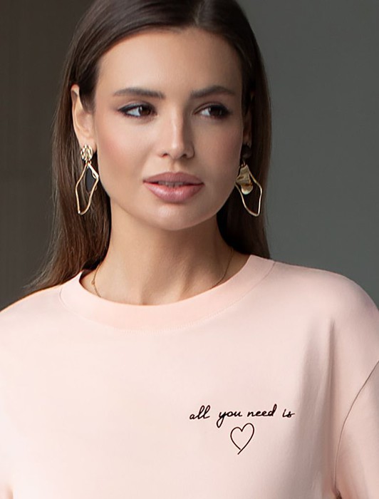 Состав: 92%Хлопок 8%ПУ Плотность: 170 Г/м2Модная футболка пудрового цвета привлекает внимание своим интересным дизайном и ярким принтом. Благодаря прямому крою изделие комфортно садится на любую фигуру, в том числе на большие размеры, и не сковывает движений. Круглый вырез подчеркивает современный стиль, а натуральный материал плотностью 170 Г/м2 из хлопка с добавлением эластана обеспечивает удобство в повседневной носке и приятные тактильные ощущения. Прочность и износостойкая структура позволяют сохранять свежий внешний вид после множества стирок. Принт в виде надписи и сердца нанесен красками с устойчивым покрытием, перевод надписи: Al you need is love- Все, что вам нужно это любовь. Стильная футболка гармонично вписывается в любой гардероб и подойдет для прогулок, отдыха или неформальных встреч. Благодаря особенностям кроя модель хорошо сидит, скрывая недостатки и подчеркивая достоинства. Яркая футболка идеально сочетается с базовыми вещами, позволяя создавать новые интересные образы каждый день.