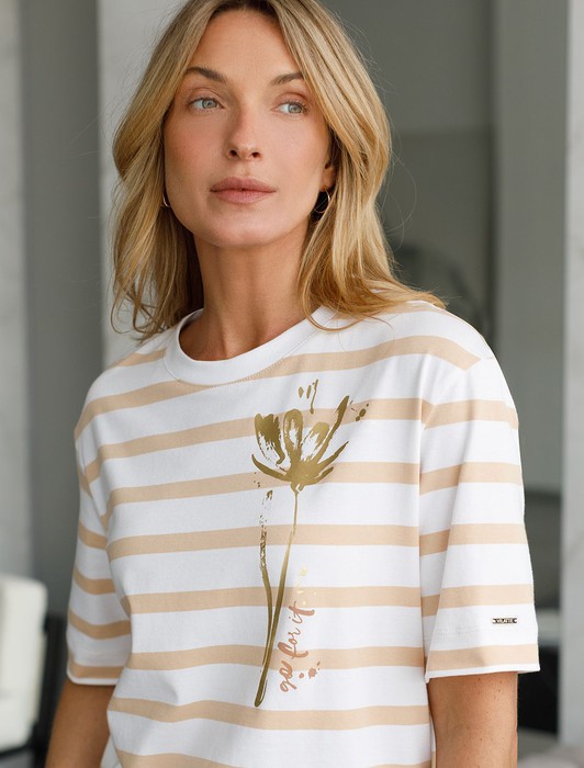 Состав: 92%Хлопок 8%ПУ Плотность: 170 Г/м2Модная футболка белого цвета в горизонтальную бежевую полоску привлекает внимание своим интересным дизайном и ярким принтом. Благодаря прямому крою изделие комфортно садится на любую фигуру, в том числе на большие размеры, и не сковывает движений. Круглый вырез подчеркивает современный стиль, а натуральный материал плотностью 170 Г/м2 из хлопка с добавлением эластана обеспечивает удобство в повседневной носке и приятные тактильные ощущения. Прочность и износостойкая структура позволяют сохранять свежий внешний вид после множества стирок. Принт в виде надписи нанесен красками с устойчивым покрытием, перевод надписи: Go for it - Действуй. Стильная футболка гармонично вписывается в любой гардероб и подойдет для прогулок, отдыха или неформальных встреч. Благодаря особенностям кроя модель хорошо сидит, скрывая недостатки и подчеркивая достоинства. Яркая футболка идеально сочетается с базовыми вещами, позволяя создавать новые интересные образы каждый день.