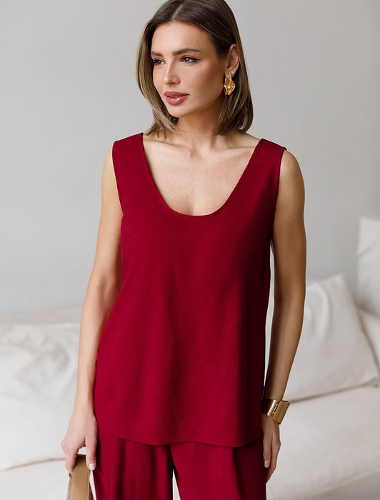 Состав: 70%Вис 30%Лен Плотность: 200 Г/м2Лаконичный топ гранатового цвета без застежек с U-вырезом выполнен изо льна с вискозой, плотносью 200 Г/м2. Сочетание льна и вискозы обеспечивает комфорт и прохладу в жаркие дни. Свободный топ на широких бретелях будет идеальным выбором для лета и весны, позволяя ощущать комфорт даже при высокой температуре воздуха. Особенность этого летнего топа — шитый по косой, он хорошо драпируется и мягко прилегает к фигуре, создавая струящиеся складки. Свободный крой топа обеспечивает комфорт, легкость и свободу движений, открытое декольте подчеркивает изысканность образа и женственность силуэта. Этот красивый топ подойдет для создания любого стильного повседневного образа, на работу или на важное мероприятие.