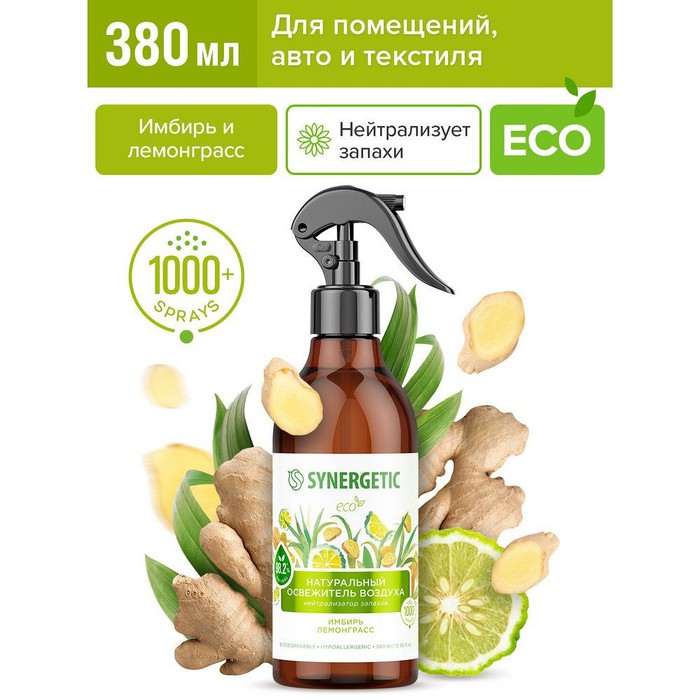 Биоразлагаемый освежитель воздуха, нейтрализатор запахов Synergetic "Имбирь и лемонграсс" на водной основе на 98,2% состоит из натуральных компонентов.