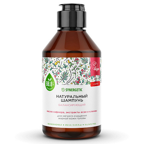 Бессульфатный шампунь Synergetic "Балансирующий для мягкого очищения жирной кожи головы" — эффективное средство для очищения кожи головы и всех типов волос — более чем на 98% состоит из натуральных компонентов.