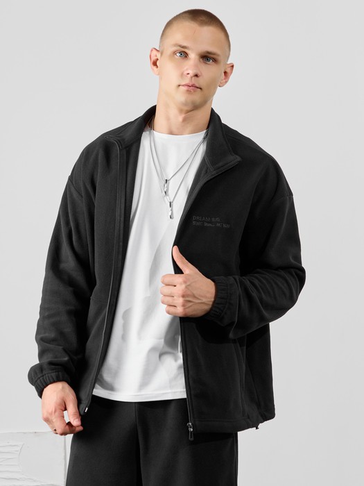 Куртка-толстовка мужская из флиса, с длинными втачными рукавами, воротником-стойкой и центральной бортовой застежкой на тесьму "молния". На полочках -кокетки и накладные карманы с вертикальными входами, на левой полочке в области груди - вышивка. Нижние срезы рукавов обработаны подгибкой с эластичной тесьмой, а низ изделия - с вложением в шов шляпной резинки с фиксаторами для регулирования степени прилегания изделия по бедрам.