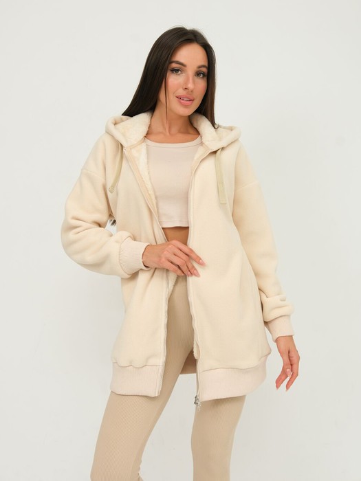 Толстовка женская из плотного флиса, дублированного мехом. Изделие с удобным капюшоном, низ тостовки заужен трикотажным поясом. Карманы в боковых рельефах. Застегивается на молнию. Рукава втачные, с эластичными манжетами.