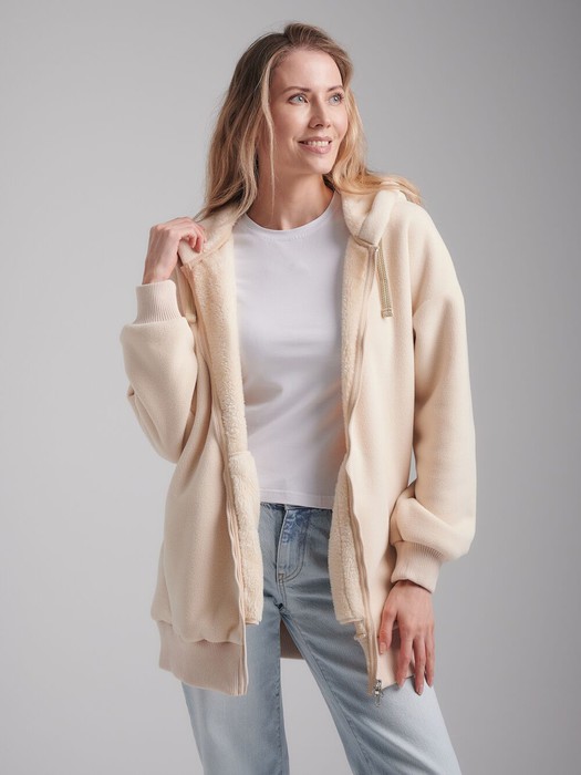Толстовка женская из плотного флиса, дублированного мехом. Изделие с удобным капюшоном, низ тостовки заужен трикотажным поясом. Карманы в боковых рельефах. Застегивается на молнию. Рукава втачные, с эластичными манжетами.